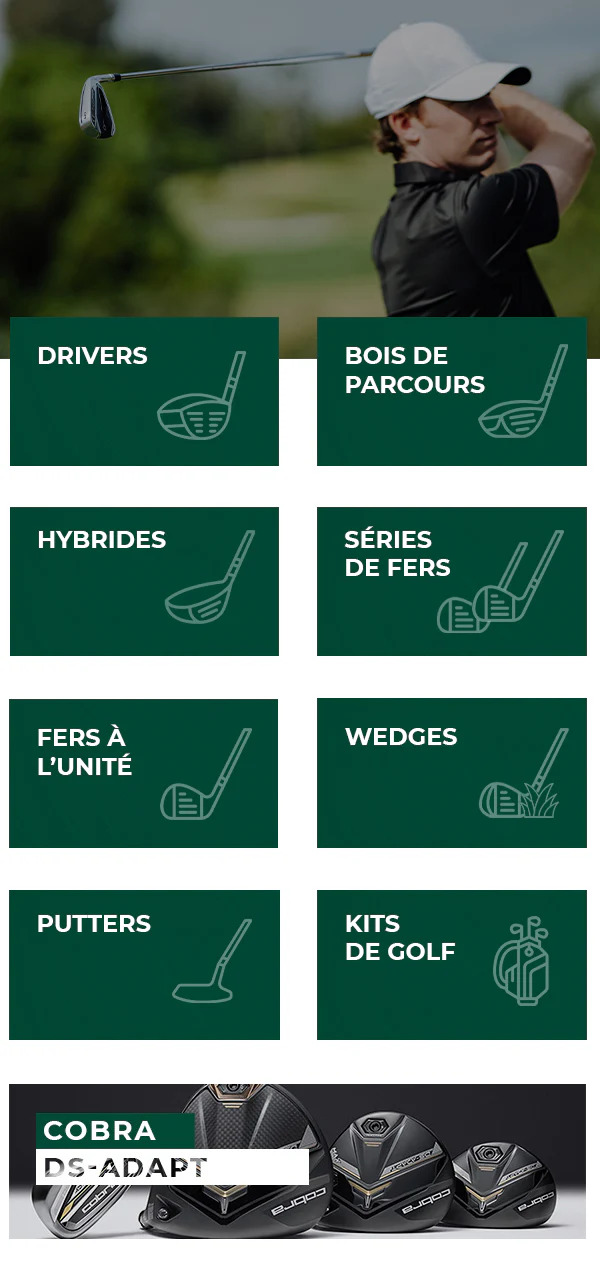 Choisissez parmi nos clubs, le driver, les bois de parcours, les fers ou les hybrides qui correspondent à votre façon de jouer. Vous avez le choix entre différentes flexibilités pour plus de confort. Vous pouvez évidemment acheter des fers en acier ou des fers en graphite, plus léger et plus facile à jouer.