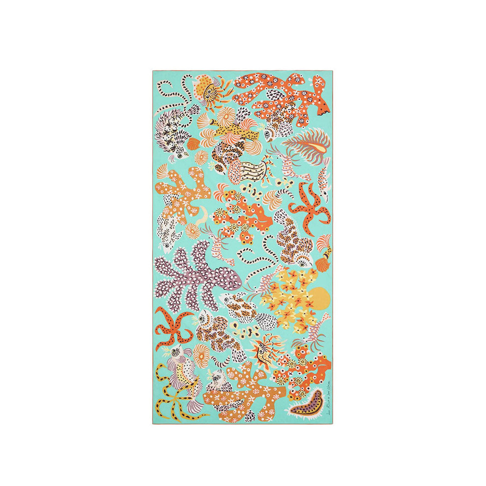 Découvrez une grande écharpe illustrée évoquant la vie sous-marine, une plongée envoûtante dans l'océan de la mode.