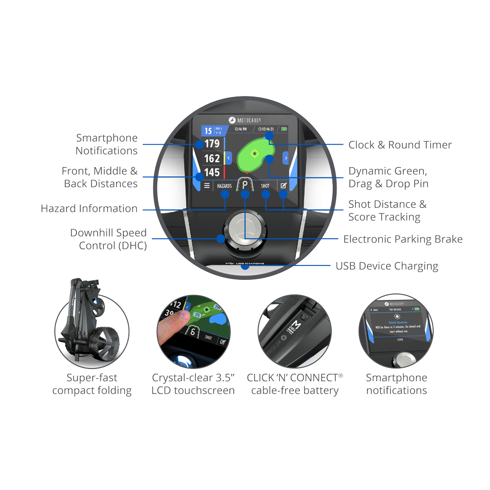 La technologie primée Motocaddy DHC régule automatiquement la vitesse du chariot lorsqu'il descend les pentes, aidant les golfeurs à rester en contrôle complet sans les mains. Cela se combine avec des pneus tout-terrain et un frein de stationnement électronique pour maintenir le chariot en place - en montée ou en descente - pendant que vous jouez votre coup. La technologie DHC révolutionnaire est désormais considérée comme une fonctionnalité essentielle pour les golfeurs du monde entier, améliorant les performances du chariot et augmentant le plaisir.