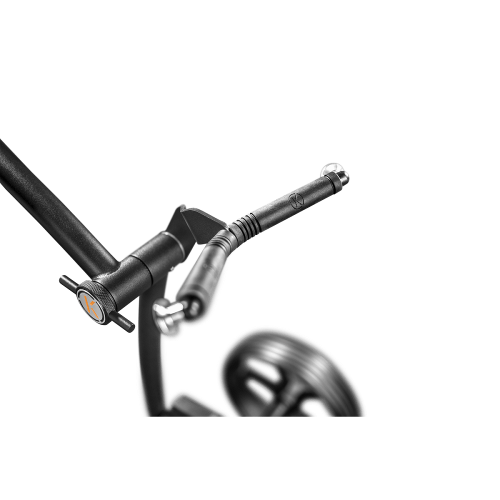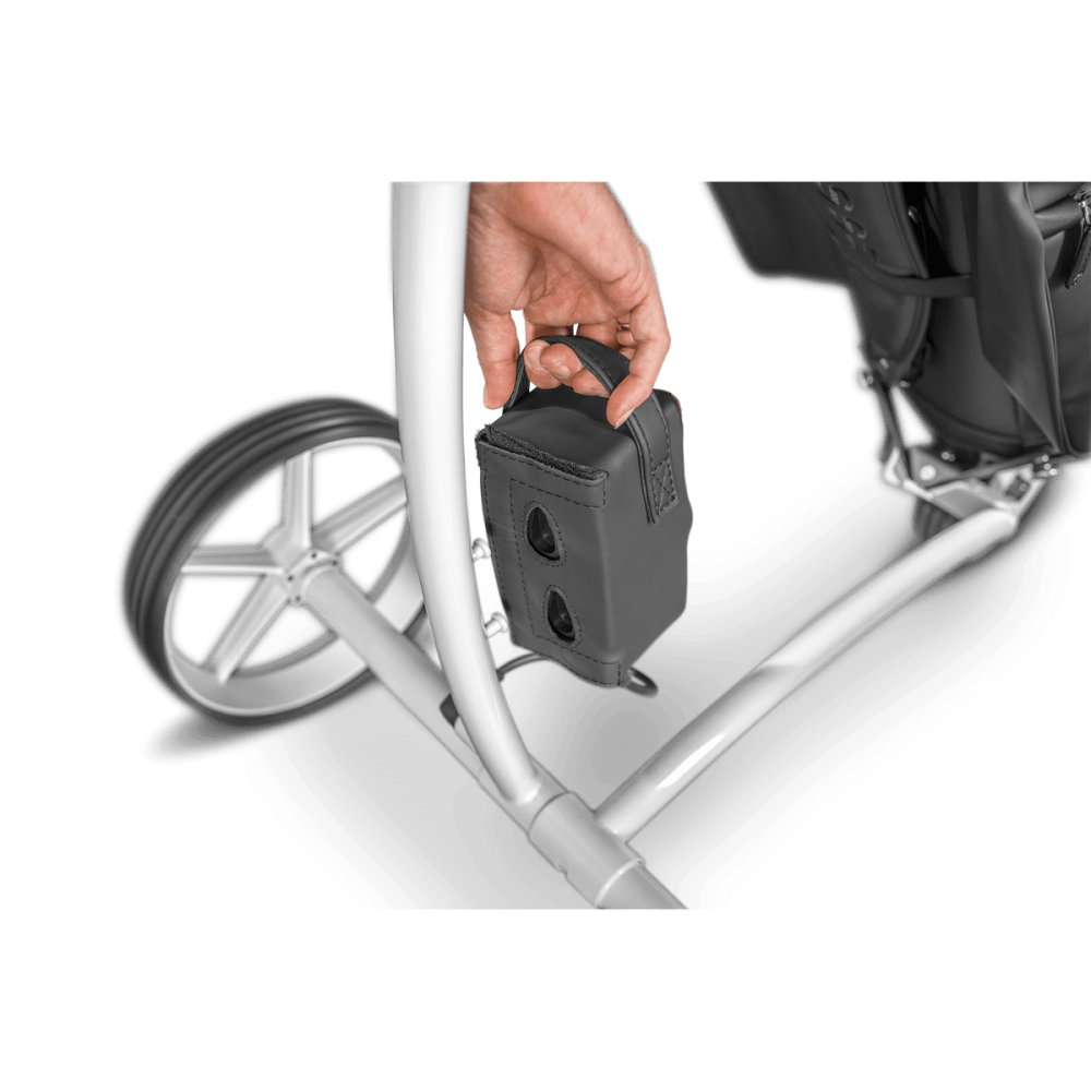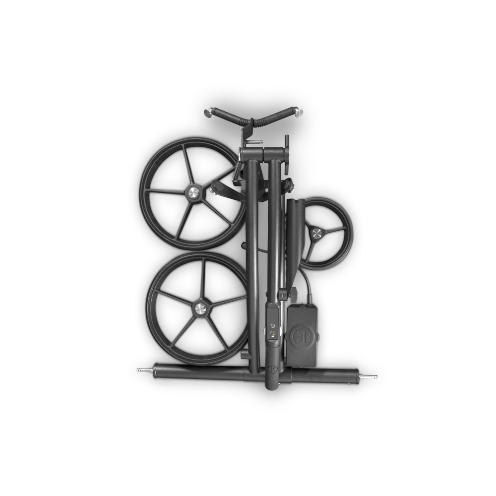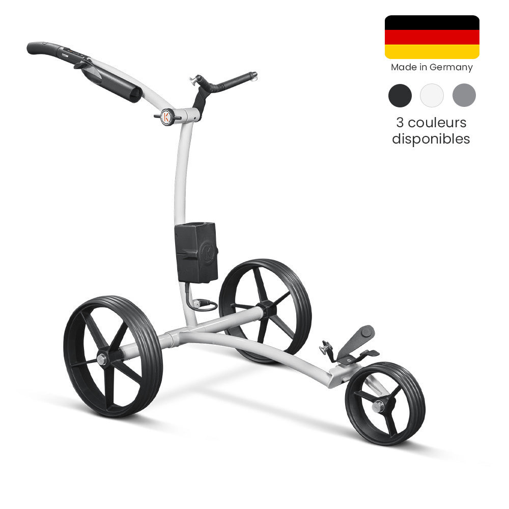 Le chariot K1 se plie et se déplie rapidement, et ses roues se retirent d’une simple pression pour un transport et un rangement faciles. Pesant 6,2 kg pour le chariot, 2,3 kg pour les roues et 1,3 kg pour la batterie, il allie légèreté et robustesse pour un confort optimal sur le parcours.