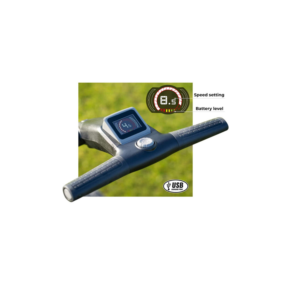 L’écran réglable assure une visibilité optimale quelles que soient les conditions de luminosité. Il affiche clairement le niveau de batterie ainsi que la vitesse, réglable de 1 à 9 par incréments de 0,5, afin d’adapter parfaitement le rythme de marche à chaque golfeur.