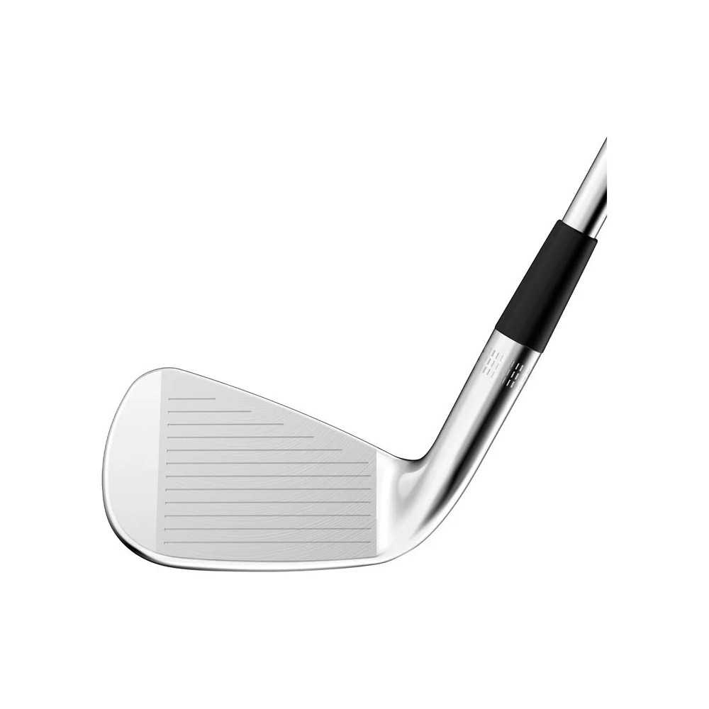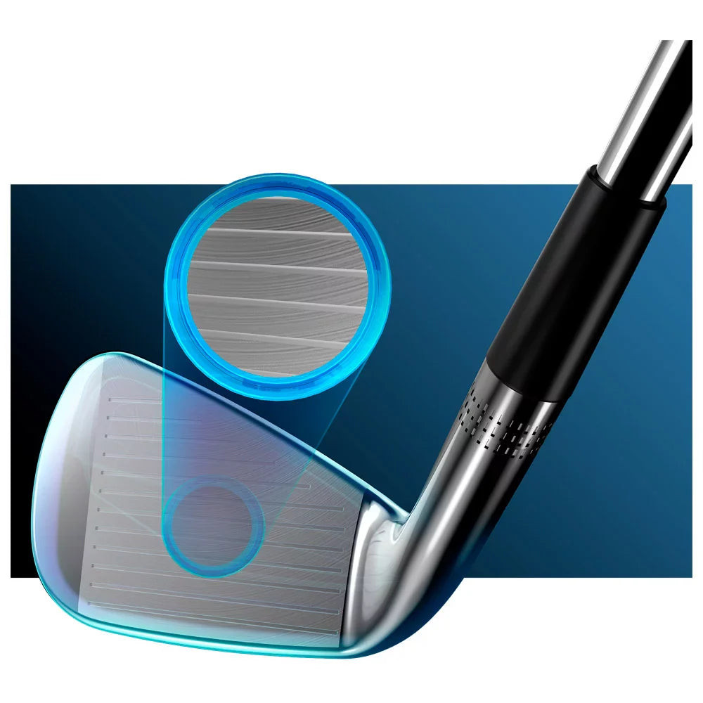 Fabriqués en acier au carbone 8620 forgé, ces fers offrent stabilité et précision. La répartition précise du poids garantit une répartition équilibrée, tandis que les rainures de la face génèrent plus de spin et une puissance d'arrêt accrue, permettant des coups précis et stratégiques à chaque swing.