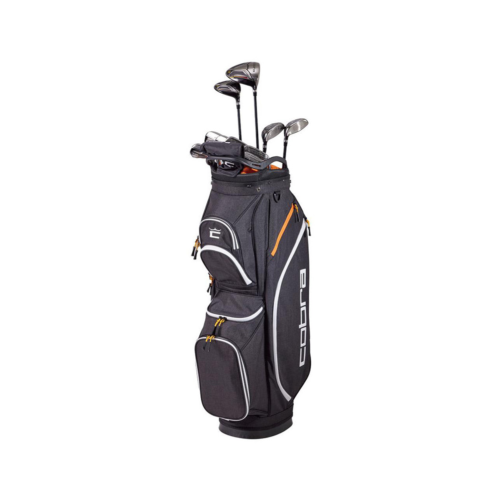 Le Cobra Fly XL acier est livré avec un sac chariot premium conçu pour une organisation optimale. Il comprend 14 compartiments pour les clubs, une poche doublée en velours pour les objets de valeur et plusieurs poches zippées pour les accessoires et vêtements. Robuste et pratique, il facilite le transport de tout votre équipement sur le parcours.