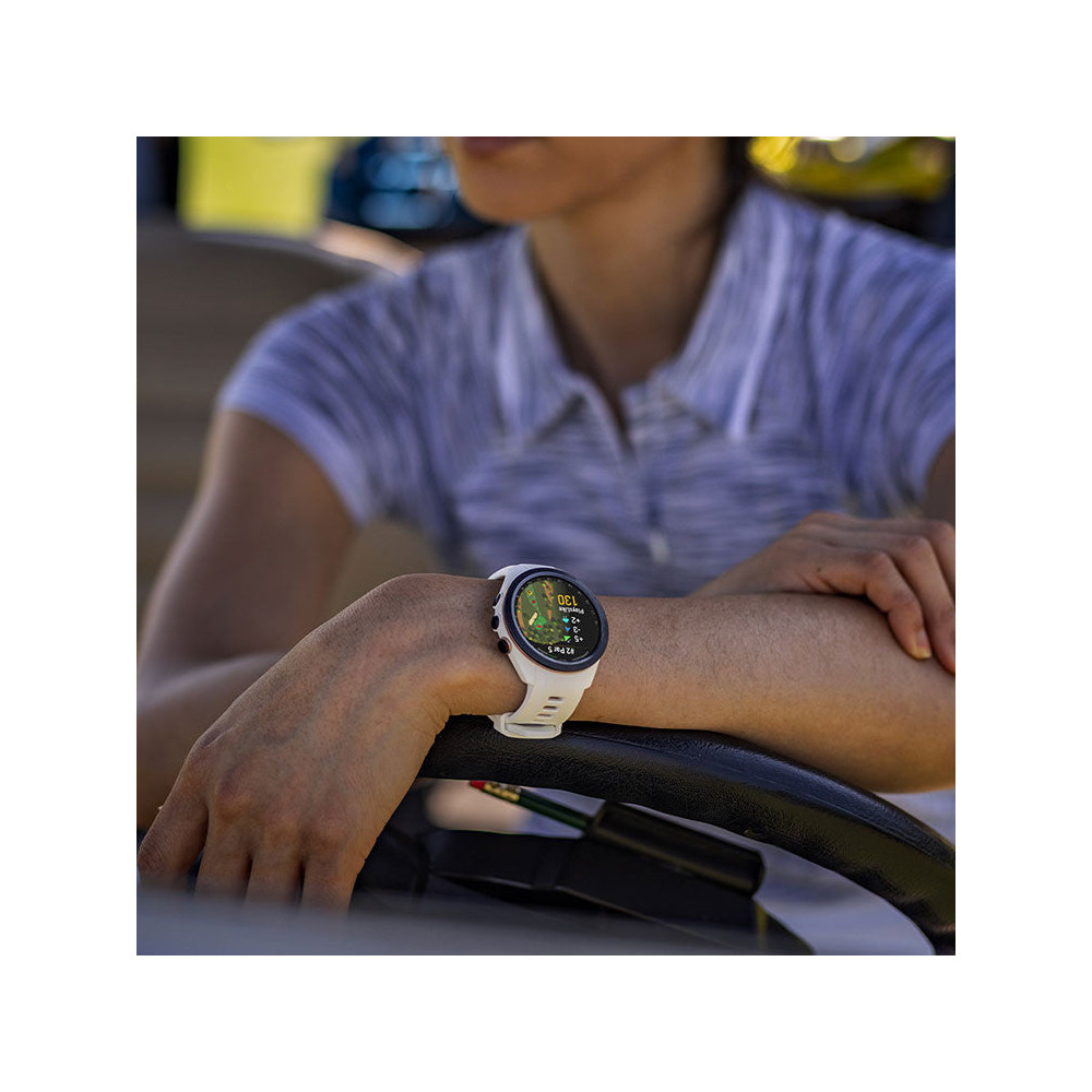| Autonomie de la batterie | Montre connectée : jusqu'à 16 jours Mode GPS : jusqu'à 20 heures (avec les paramètres d'affichage par défaut : sortie de veille par geste en mode montre connectée et écran toujours allumé pendant les parties de golf) |