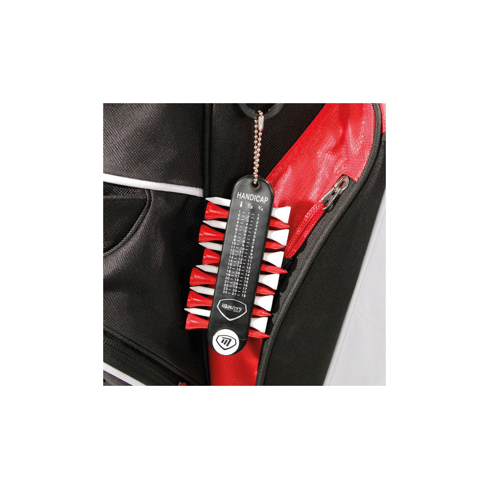 Ce support comprend douze tees, un crayon, un marqueur de balle, un calculateur de handicap et peut être accroché à votre sac de golf.