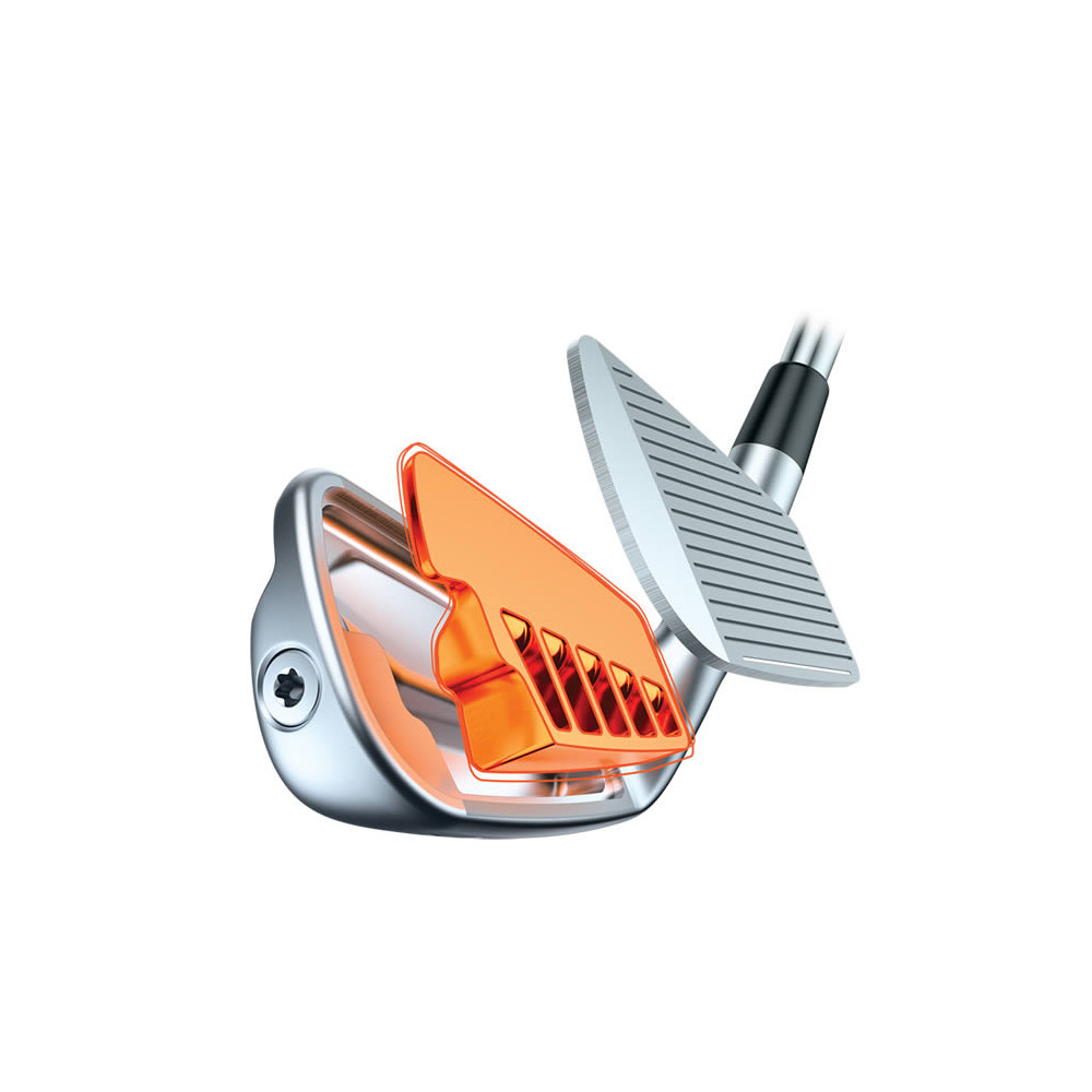 L'insert en aluminium AlumiCore permet de redistribuer 30 grammes de matériau du centre du club vers le talon et la pointe. Cette conception ingénieuse augmente le Moment d'Inertie (MOI) pour atteindre celui des fers PING i210, offrant ainsi une stabilité accrue et une tolérance supérieure sur chaque coup.