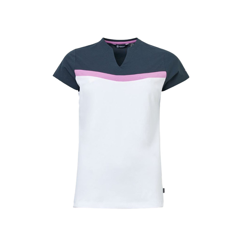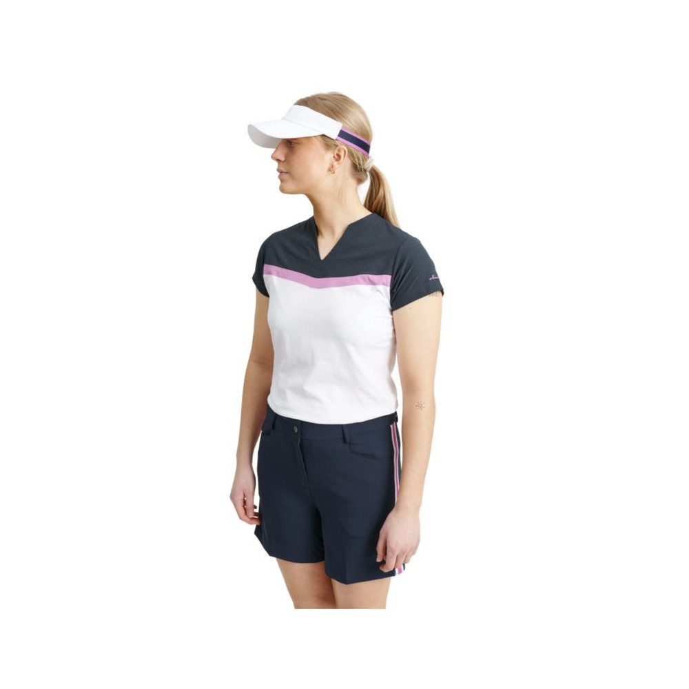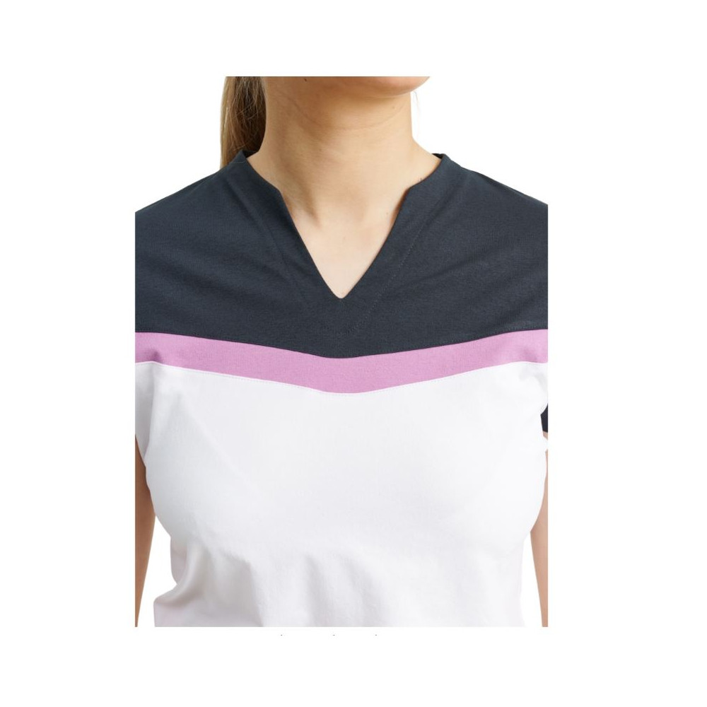 Le polo Erin de la marque Abacus est un choix raffiné pour les golfeuses. Son col en V souligne une silhouette élégante, tandis que les contrastes de couleurs en rose, violet, bleu marine et blanc apportent une touche dynamique et moderne. Un logo Abacus subtilement positionné sur la manche gauche témoigne de la qualité et du style de ce modèle.