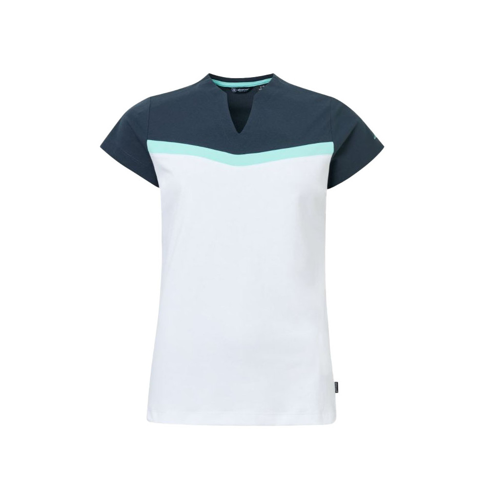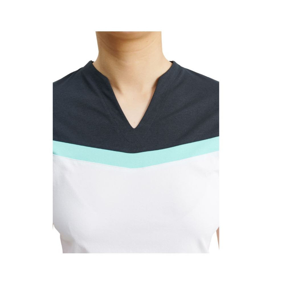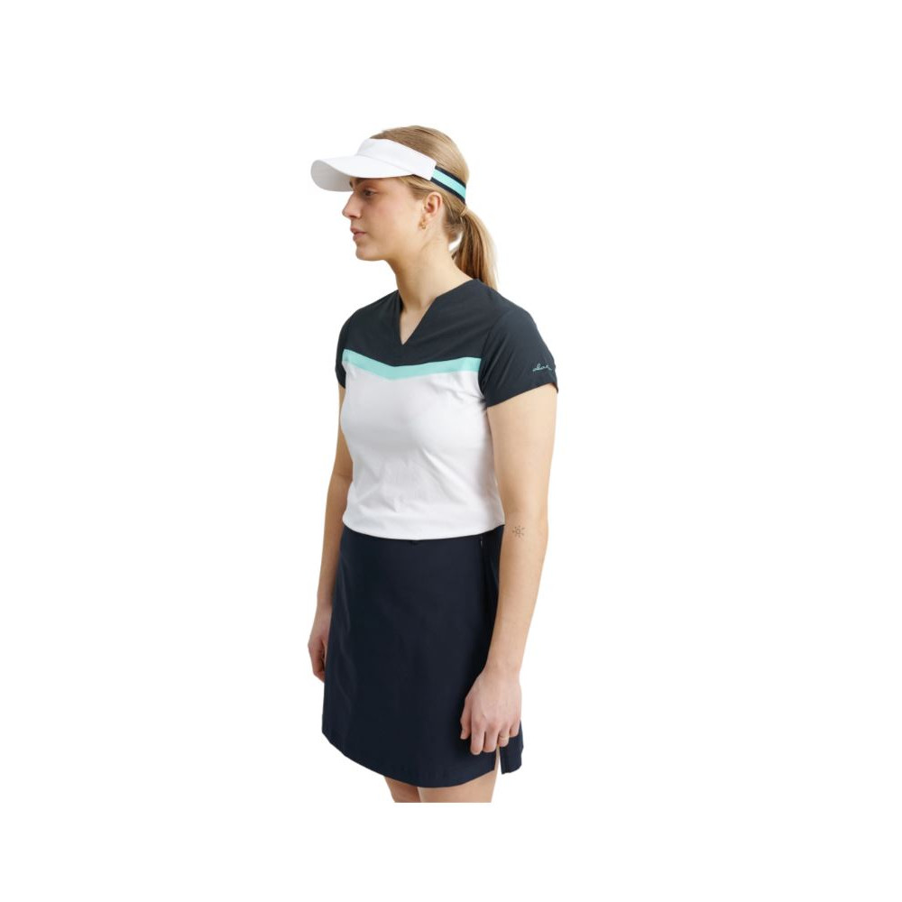 Le polo Erin de la marque Abacus est un choix raffiné pour les golfeuses. Son col en V souligne une silhouette élégante, tandis que les contrastes de couleurs en rose, violet, bleu marine et blanc apportent une touche dynamique et moderne. Un logo Abacus subtilement positionné sur la manche gauche témoigne de la qualité et du style de ce modèle.