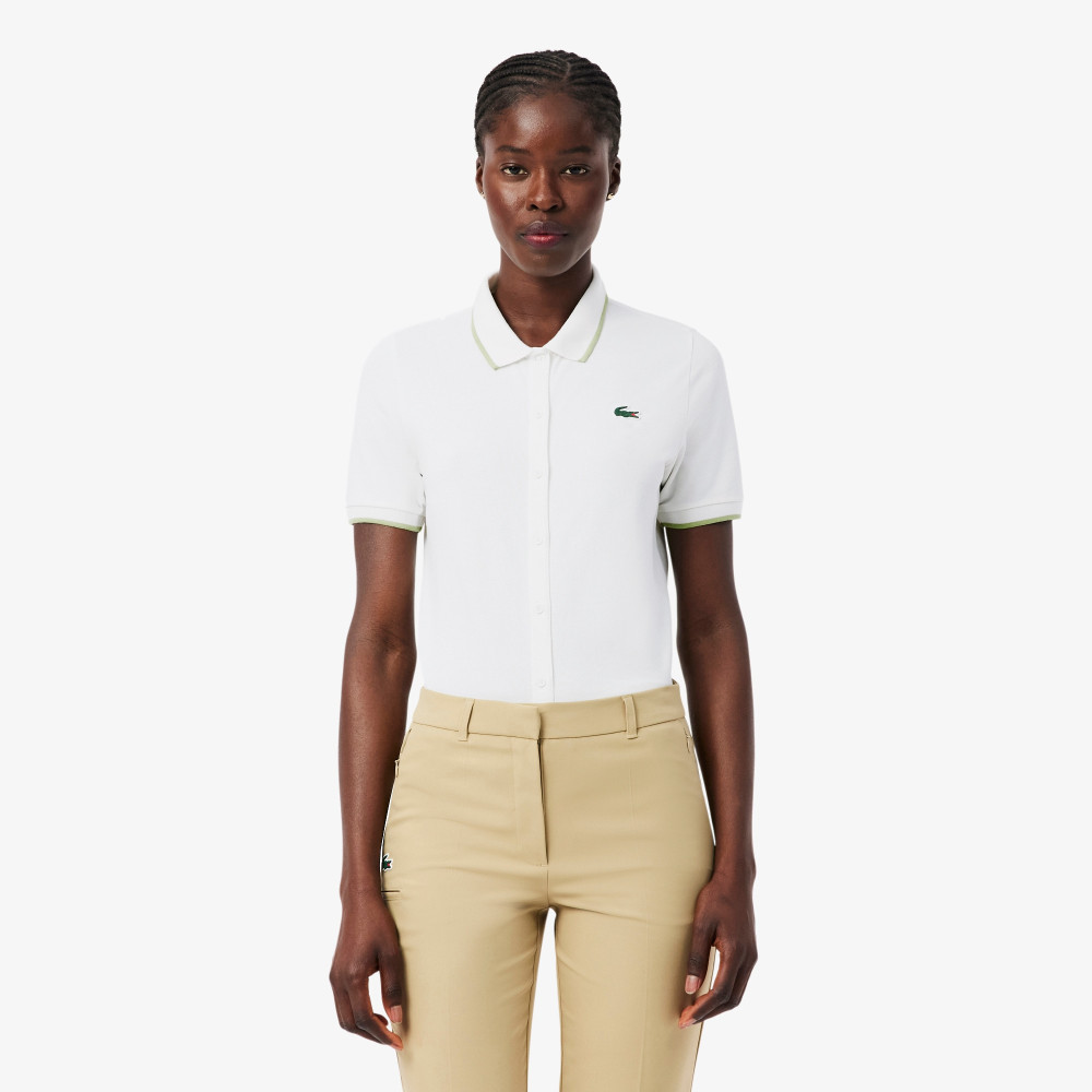Le design soigné fait de ce polo un véritable allié style sur le parcours comme en dehors. La longue patte de boutonnage apporte une touche féminine et sophistiquée, tandis que le col et le bas de manches côtelés avec liserés contrastants structurent la silhouette.