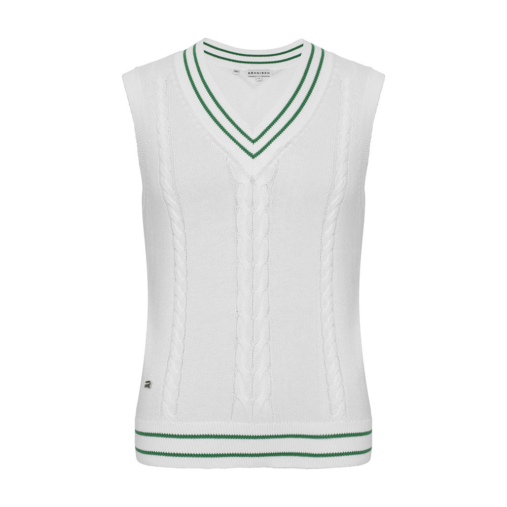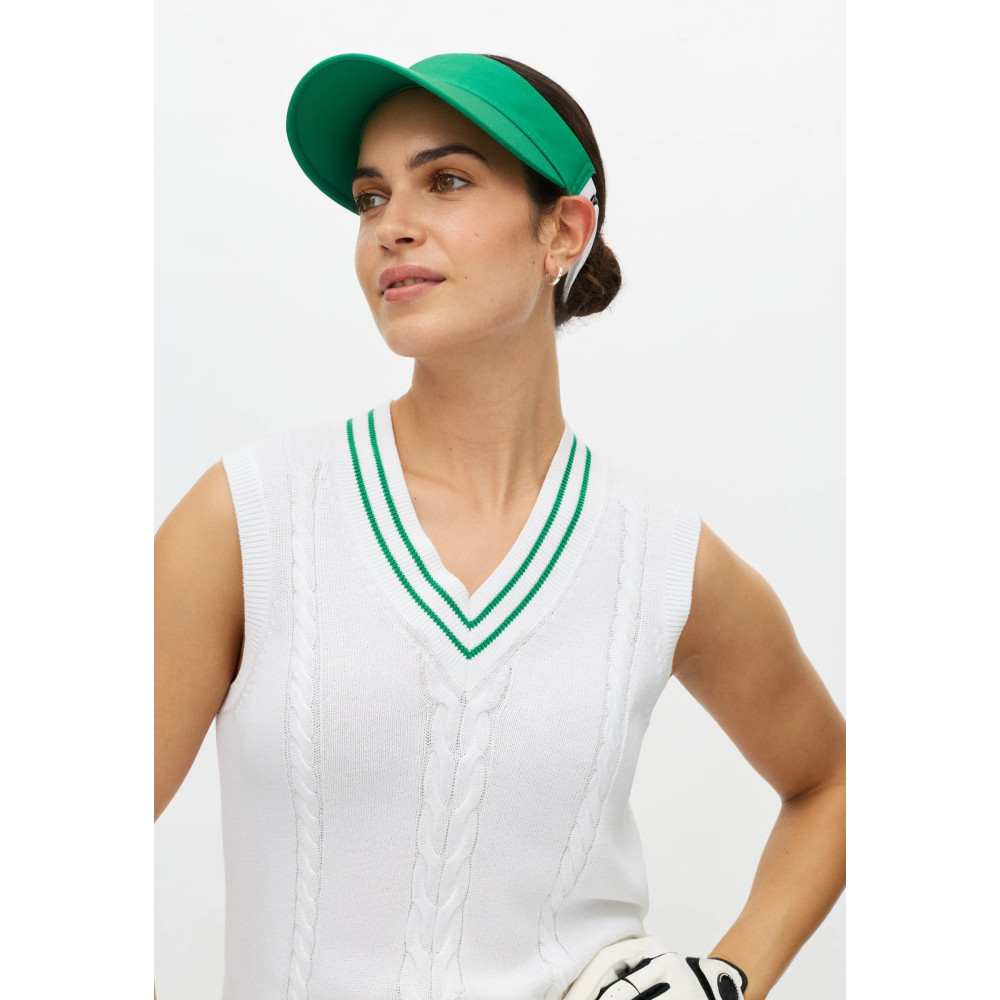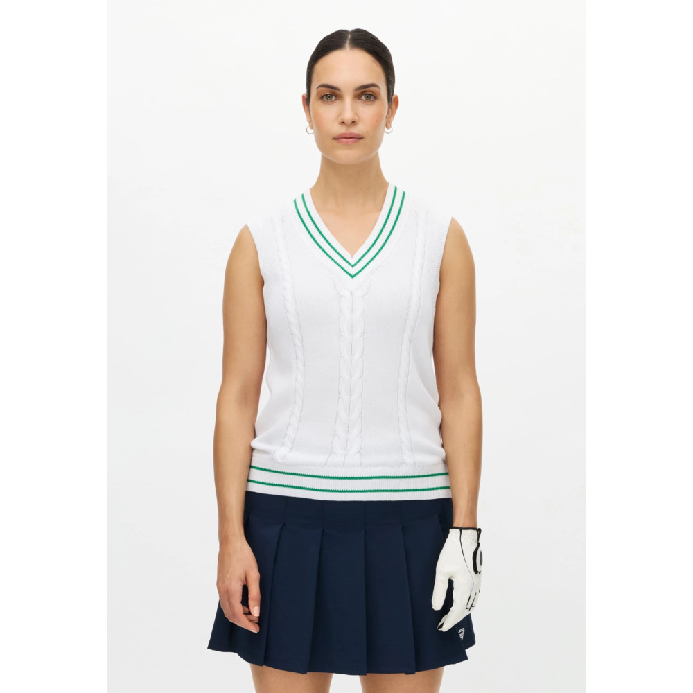 Le Cotton Cable Vest de Röhnisch revisite avec modernité l'indémodable pull sans manche torsadé. Ce gilet en coton doux offre une interprétation contemporaine du style preppy, idéal pour les joueuses qui recherchent une pièce de superposition élégante. Sa maille respirante et son design structuré en font un vêtement de choix pour parfaire votre tenue de golf tout en conservant une liberté de mouvement absolue au niveau des bras.