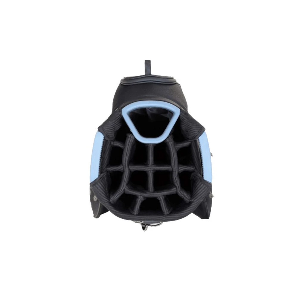 Le sommet du sac dispose de 14 compartiments séparés, permettant d'isoler chaque club de votre série. Cette configuration empêche les shafts de s'entrechoquer et les têtes de clubs de s'abîmer durant le transport sur votre chariot. Le maillage texturé utilisé sur le dessus du sac et sur la sangle de transport apporte une protection supplémentaire tout en renforçant l'aspect luxueux de l'ensemble.