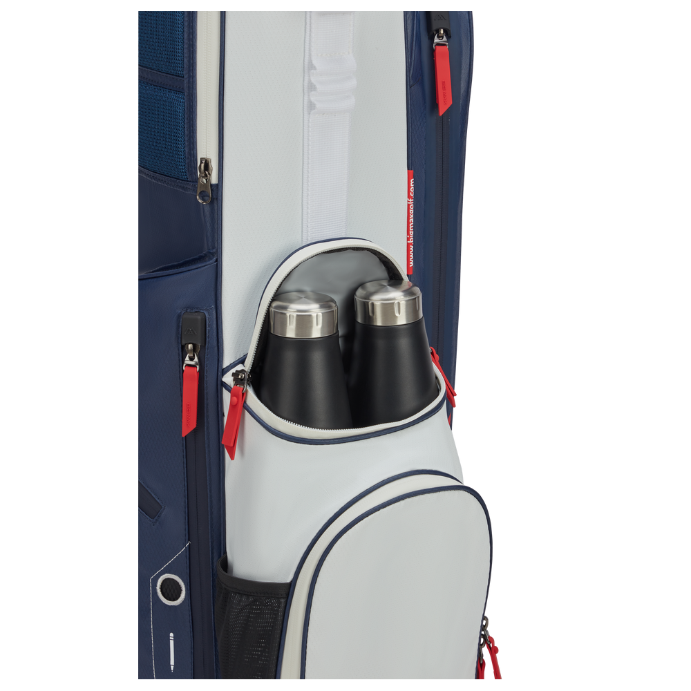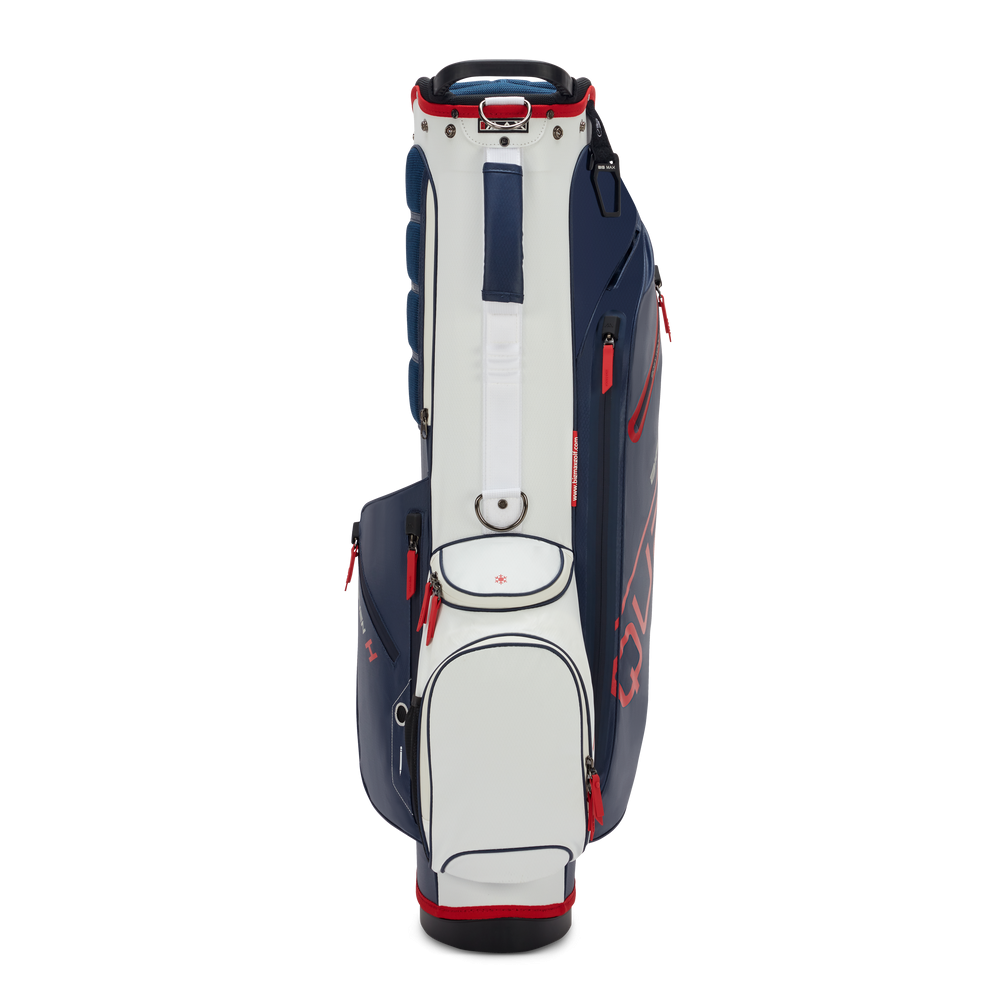 Le sac est équipé d’une poignée de transport allongée avec porte-tees intégrés pour un accès rapide. Il dispose également d’un porte-parapluie, d’une housse de pluie incluse et d’une bandoulière rembourrée assurant une répartition équilibrée du poids lors du portage.