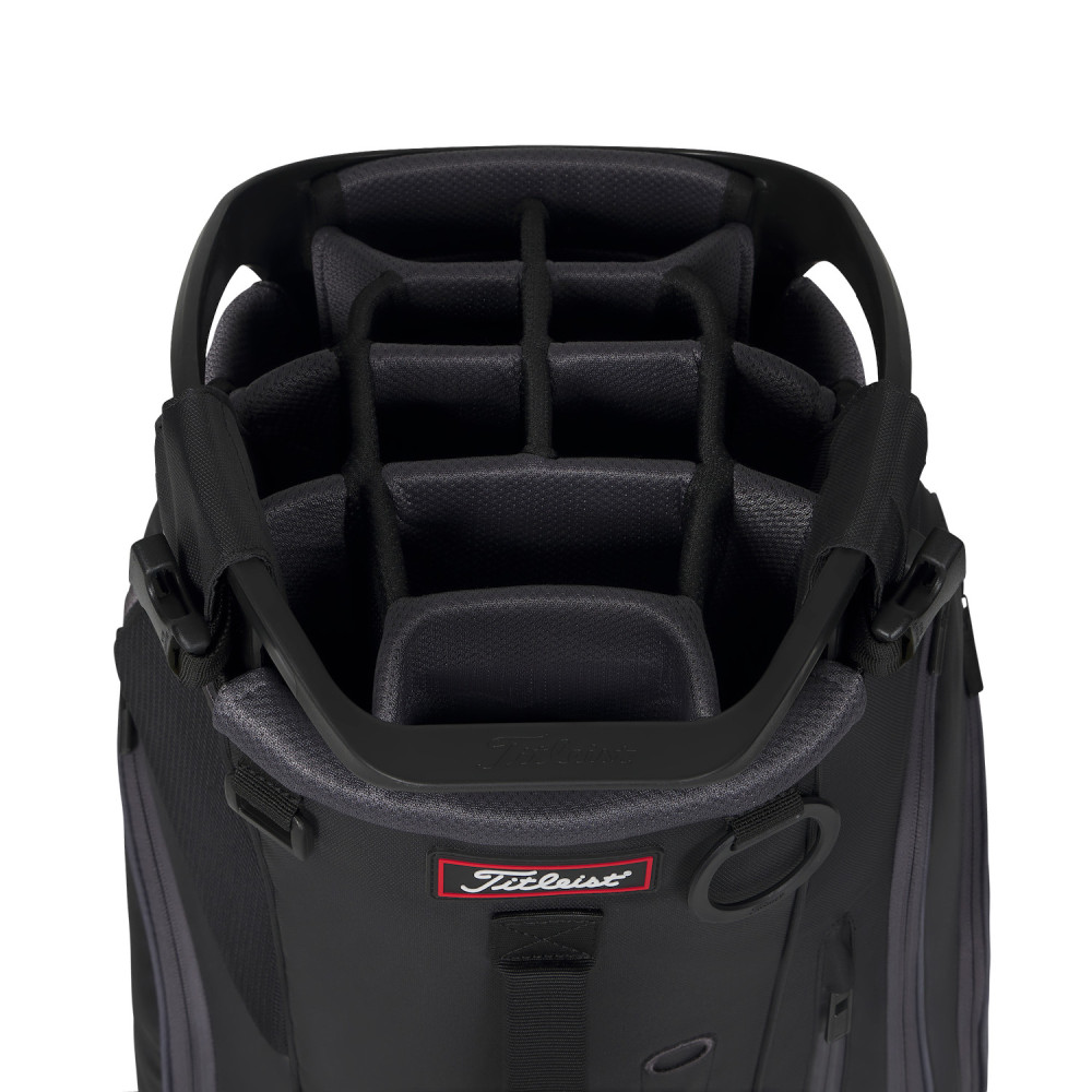 Le point fort du Titleist Hybrid 14 réside dans son sommet compartimenté. Contrairement aux sacs trépieds standards, il dispose de 14 séparations individuelles permettant de dédier un espace spécifique à chaque club. Cette configuration prévient l'entrechoquement des têtes de clubs et facilite grandement la sélection de votre fer ou de votre bois pendant la partie. Les poignées intégrées au collet de 22,5 cm assurent une manipulation aisée, que ce soit pour soulever le sac du coffre de votre voiture ou pour l'ajuster sur votre équipement de transport.
