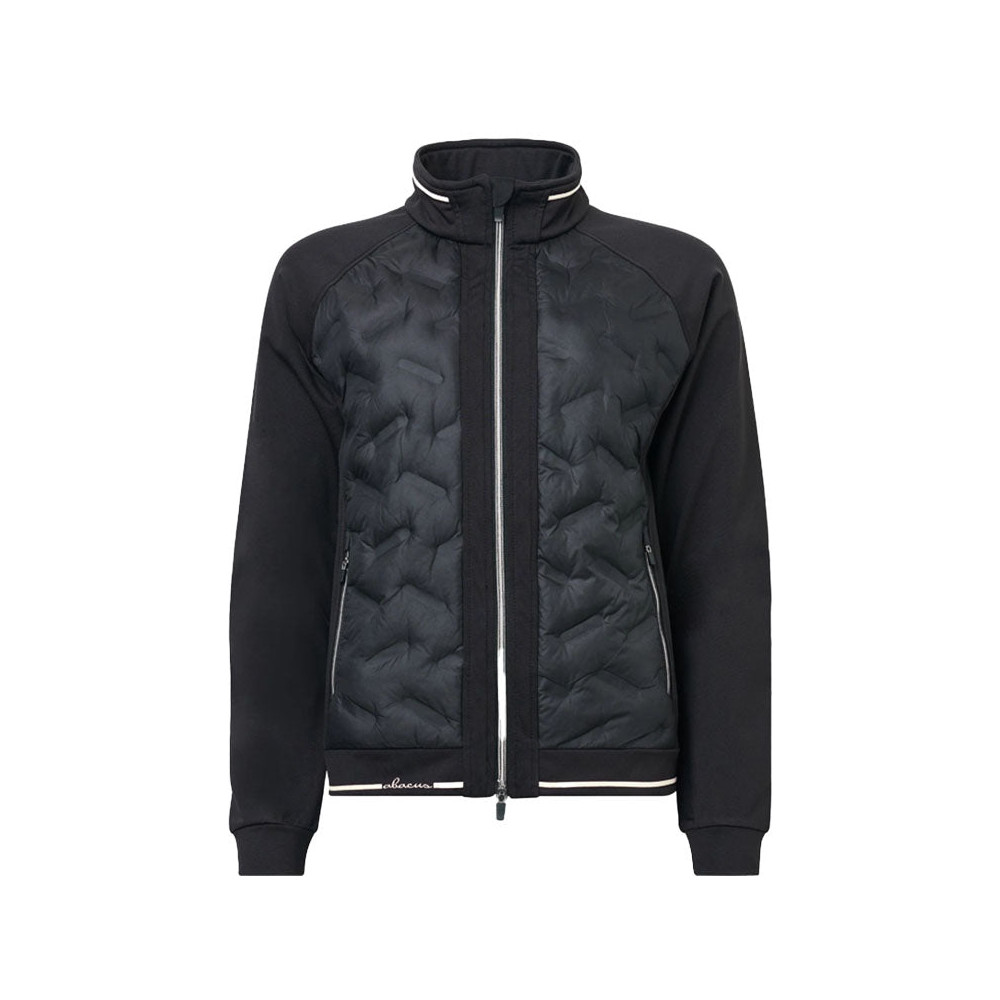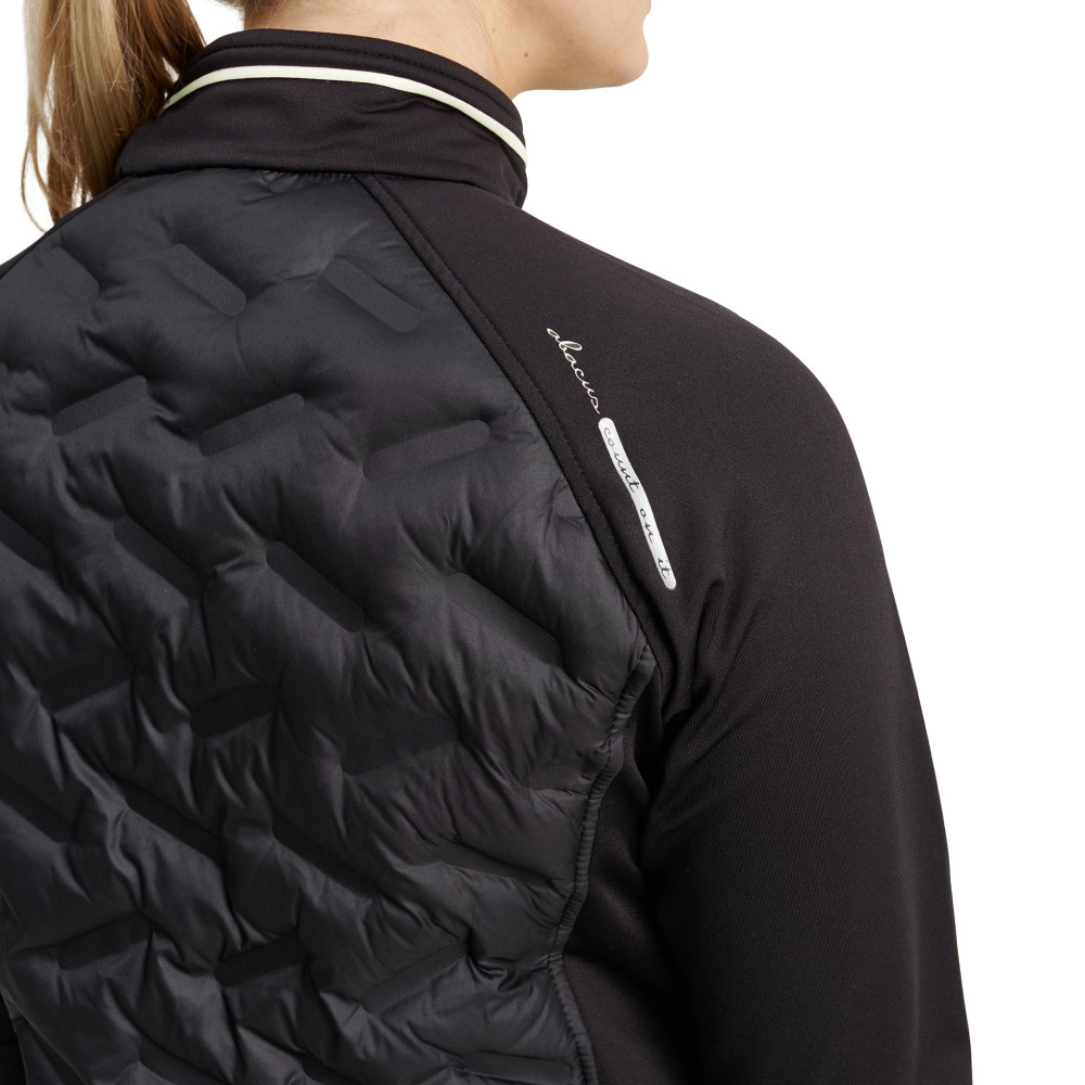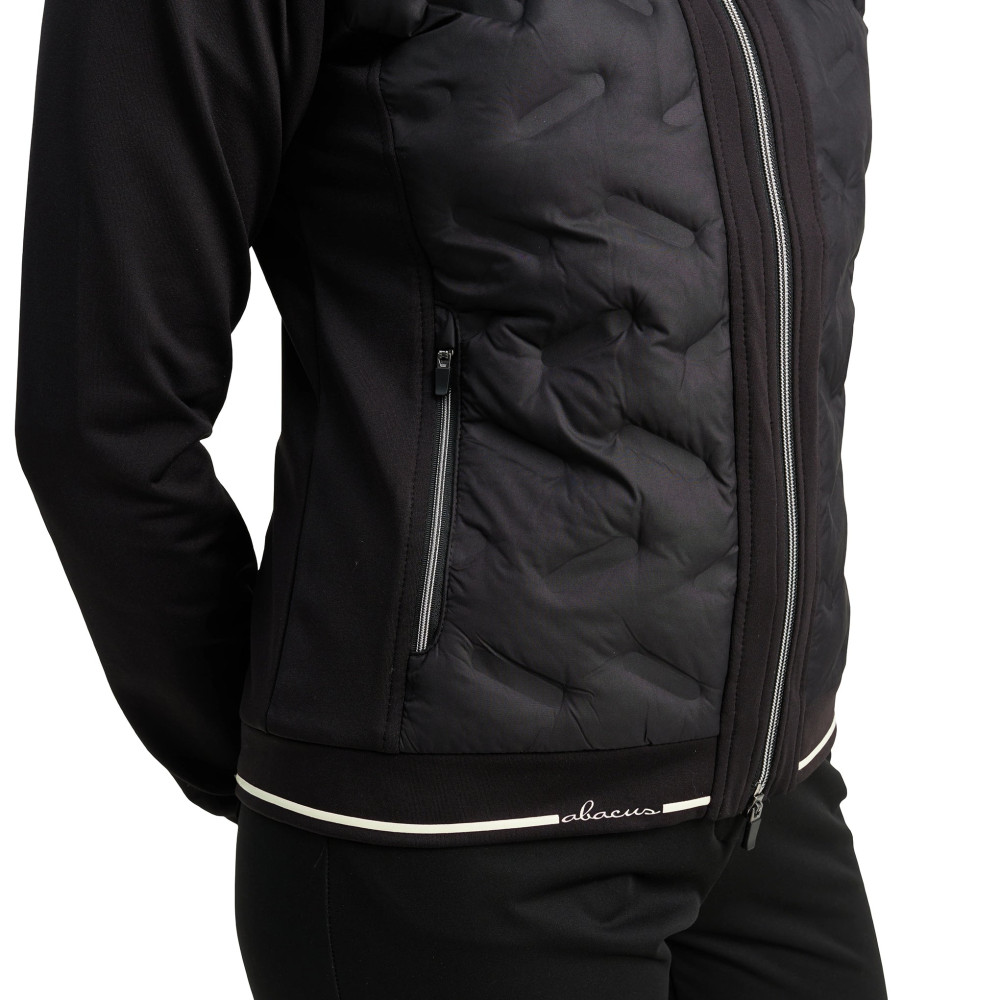 La veste hybride Grove pour femme de la marque Abacus, en coloris Black, est conçue pour offrir chaleur et confort grâce à son tissu matelassé sans couture et coupe-vent à l'avant et à l'arrière. Les panneaux latéraux, les manches et les épaules sont réalisés en polaire très extensible pour une meilleure liberté de mouvement. La polaire, respirante et brossée à l'intérieur, garantit un confort optimal. Équipée d'une fermeture éclair intégrale à l'avant et de poches latérales zippées, cette veste est parfaite pour les journées fraîches sur le parcours.