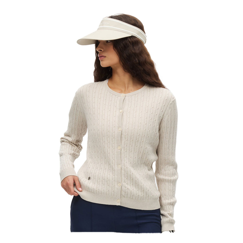 Le cardigan Classic Luxurious Cotton de Röhnisch est la définition même du luxe discret pour la golfeuse moderne. Ce tricot torsadé (cable knit) allie une esthétique traditionnelle à une coupe contemporaine, offrant une sophistication tranquille sur le parcours comme à la ville. Conçu pour se superposer sans effort, ce gilet apporte une chaleur légère et un confort raffiné, idéal pour les départs matinaux ou les fins de journées fraîches au club-house.