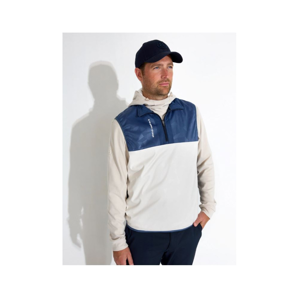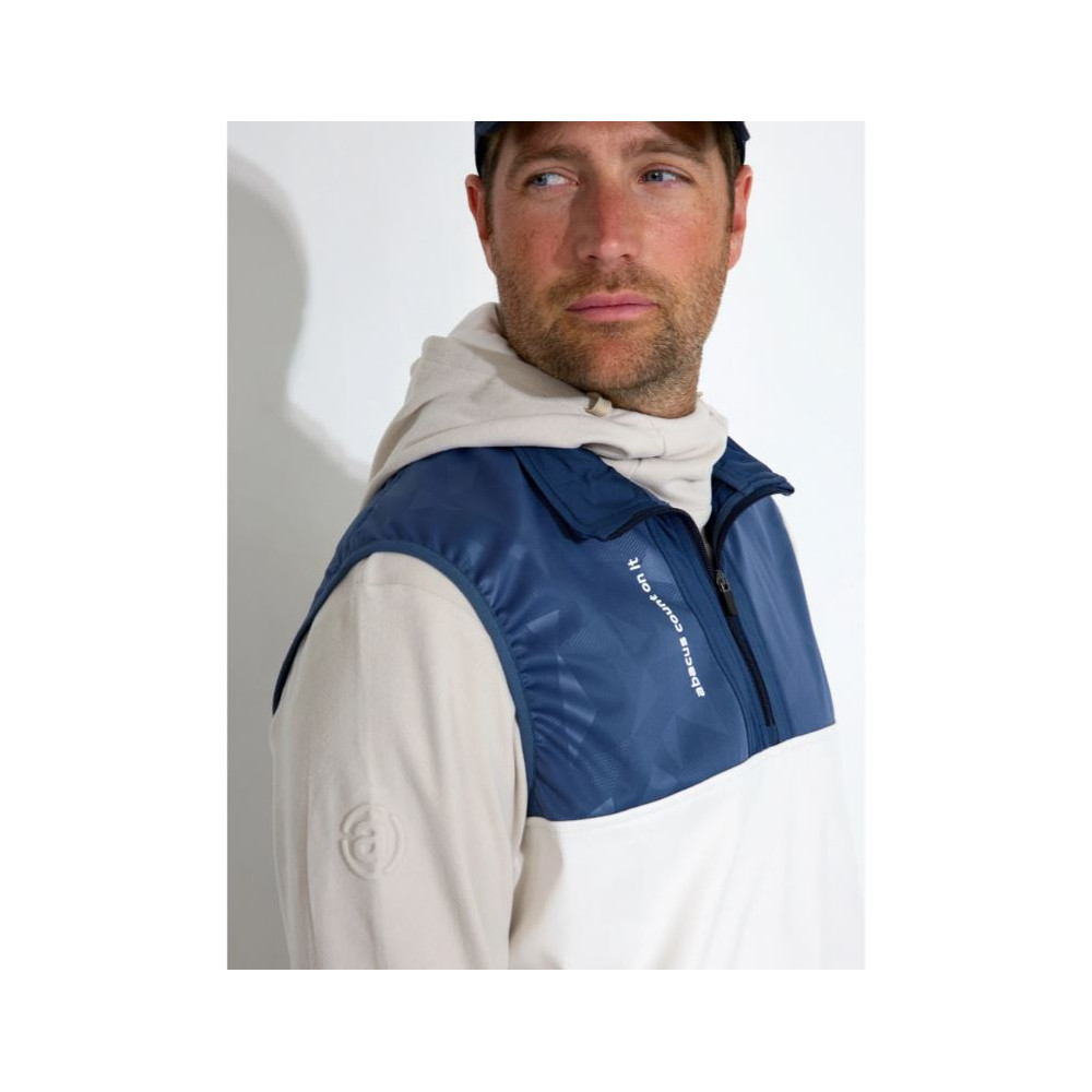 La veste hybride 1/4 zip Kingsbarns de la marque Abacus est l’alliée parfaite pour les journées venteuses mais tempérées. Conçue avec une combinaison de softshell déperlant à l’avant et sur les épaules, et de fleece stretch brossé dans le dos, elle offre un équilibre idéal entre protection, chaleur et liberté de mouvement.